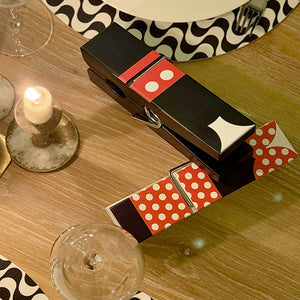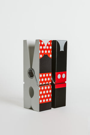 La coppia di mollette Mr. T. e Ms. T. è un’esplosione di personalità, ironia e colore, pensata per chi ama decorare con un tocco vivace e giocoso. Le due grafiche — una in nero con dettagli rossi e bottoni bianchi, l’altra in bianco con fiocco a pois rossi — reinterpretano in chiave stilizzata una coppia iconica del mondo cartoon, trasformandola in due piccoli oggetti decorativi capaci di portare immediatamente allegria e carattere in qualsiasi ambiente.