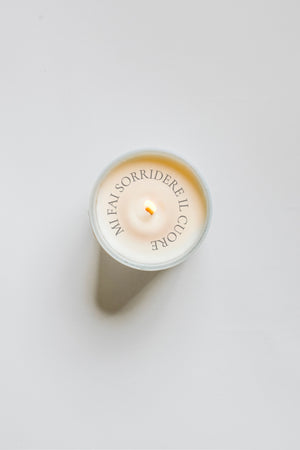 Ogni candela profumata Mi fai sorridere il cuore è realizzata a mano in Italia, colata con cura in cera di soia 100% vegetale, cruelty-free e senza paraffina. Una scelta consapevole, delicata sulla pelle e gentile verso l’ambiente, proprio come l’amore che vuole rappresentare.