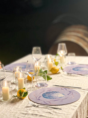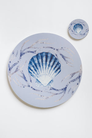 La grafica, identica su sottopiatto e sottobicchiere, raffigura una grande conchiglia blu al centro, incorniciata da rami di corallo stilizzati in tonalità acquerellate su uno sfondo azzurro polvere. Un insieme armonico e bilanciato che crea una mise en place fresca, serena e sofisticata.