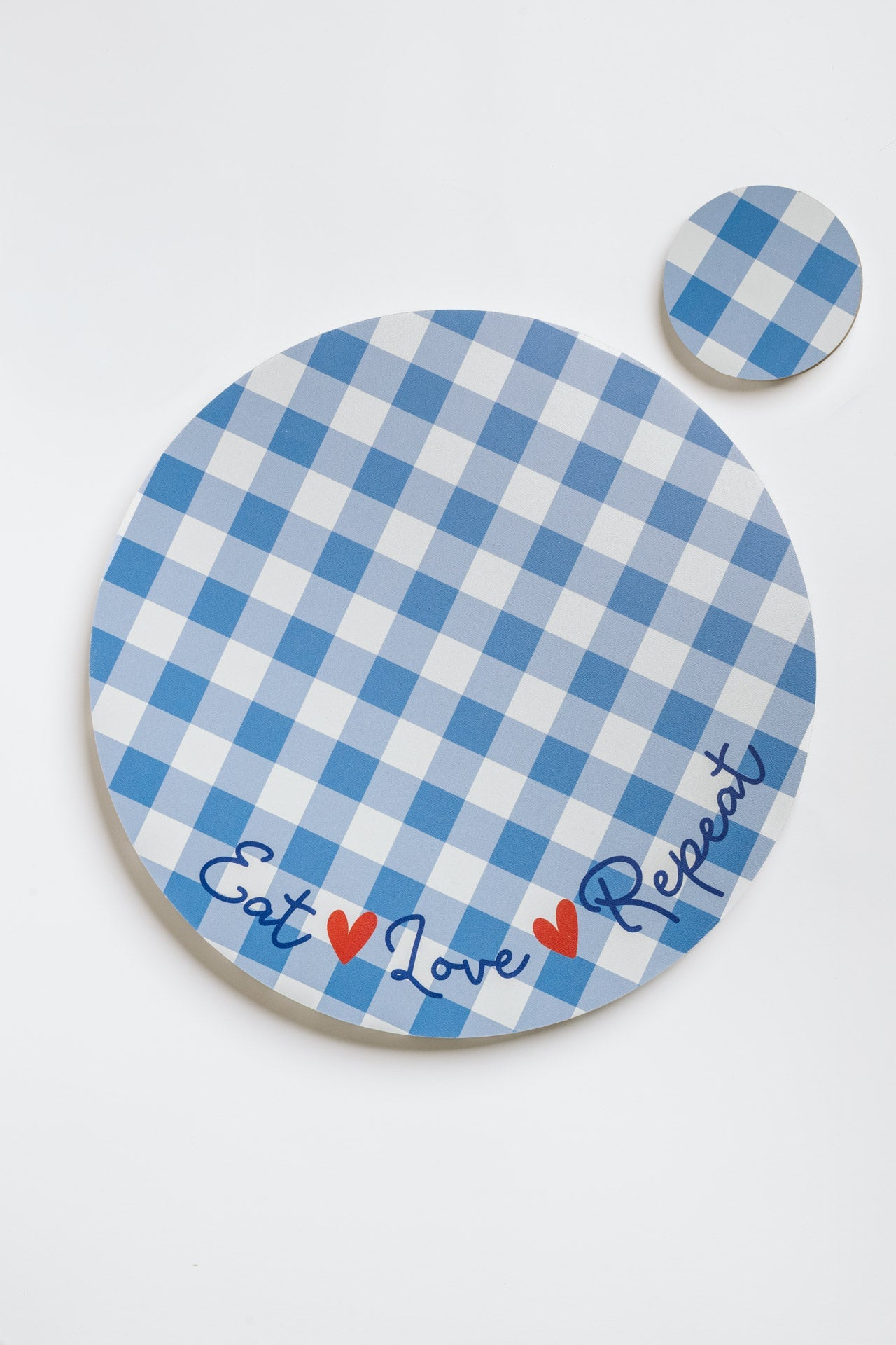 Con il suo stile semplice, ironico e senza tempo, il Set 4 sottopiatti + Set 4 sottobicchieri – Eat, Love, Repeat è pensato per chi ama la convivialità e vuole portare in tavola un tocco di spensieratezza. Ispirato alla classica tovaglia a quadretti, il pattern in bianco e blu viene rivisitato in chiave contemporanea, arricchito dalla scritta “Eat ♥ Love ♥ Repeat” in stile lettering fatto a mano.