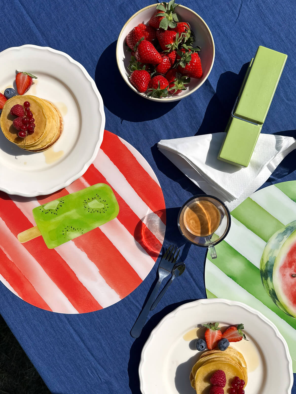 Ideali per colazioni all’aperto, brunch in compagnia o merende estive, sono realizzate in materiale plastico resistente e lavabile. Proprio per questo sono perfette come tovagliette antimacchia, capaci di coniugare stile e praticità in un solo gesto: basta un panno umido per pulirle in pochi secondi.