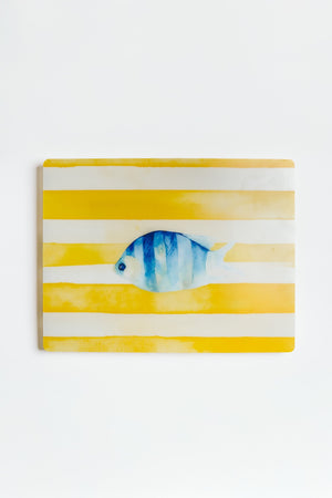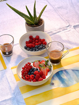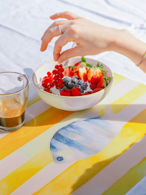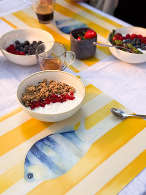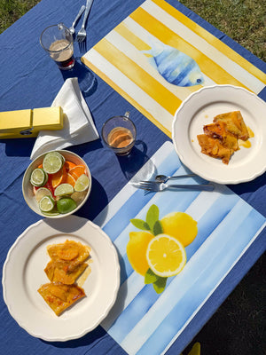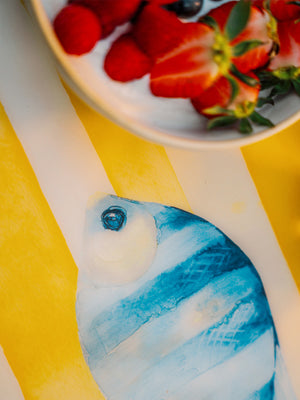 Il design raffigura una serie di pesci stilizzati in diverse forme e colori, su uno sfondo blu che richiama i fondali marini. Un’illustrazione giocosa e originale, perfetta per colazioni all’aperto, pranzi in terrazza o cene a tema. Le tovagliette americane della linea Pesci trasformano anche la mise en place più semplice in una composizione creativa e piena di energia.