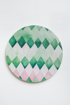 La grafica acquerellata a rombi alterna toni di verde intenso e smeraldo a tocchi di bianco e rosa pastello, dando vita a un pattern dinamico, morbido e visivamente stimolante. L’effetto finale è una composizione luminosa e ariosa, che riesce a essere al tempo stesso rilassata e di grande impatto. È il sottopiatto perfetto per chi ama una tavola creativa, giocosa ma sempre curata nei dettagli.