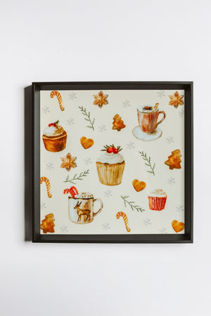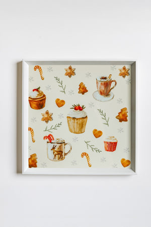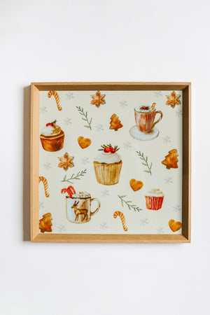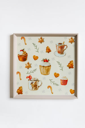 Al centro del vassoio spiccano cupcake stilizzati e decorazioni vivaci, che evocano l’allegria dei momenti condivisi: una colazione lenta, un tè con gli amici o una merenda festosa. I colori tenui ma allegri si abbinano facilmente a cucine moderne o spazi creativi.