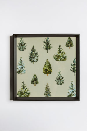 La superficie interna mostra una composizione grafica sobria e raffinata, con pini stilizzati su uno sfondo chiaro: un richiamo discreto alla natura e alla bellezza dell’inverno. Il bordo pulito dona equilibrio e rende il vassoio adatto sia a tavole classiche sia ad ambienti moderni.