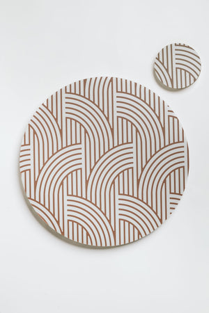La grafica a intreccio presenta un motivo geometrico marrone su fondo bianco, che ricorda un disegno a maglia o una texture architettonica. Il risultato è un set raffinato, essenziale ma con forte personalità, capace di aggiungere ordine e ritmo a qualsiasi mise en place.