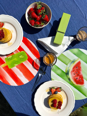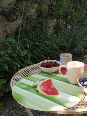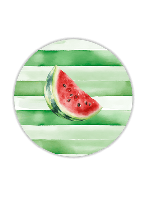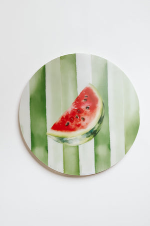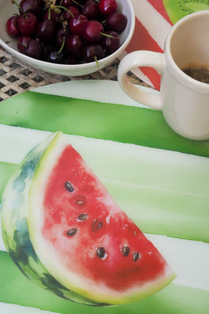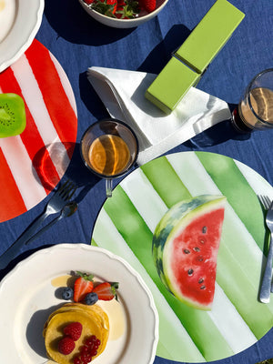 L’illustrazione raffigura fette d’anguria mature su uno sfondo a righe acquarellate verde acqua, ispirato alla buccia del frutto. Un design allegro ma curato, che aggiunge freschezza e brio a ogni mise en place, rendendola ideale per chi cerca una tavola fruttata, vivace e diversa dal solito.