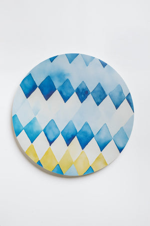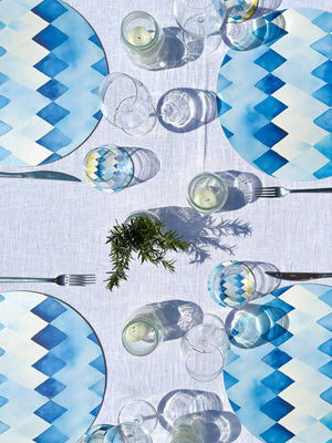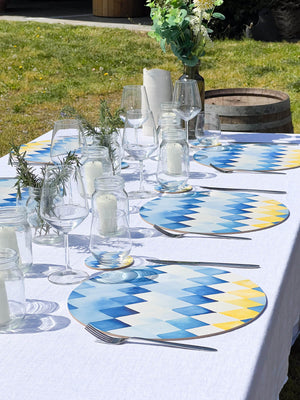 Il sottopiatto Rombi Blu arreda anche da solo, ma si abbina perfettamente al sottobicchiere coordinato per una mise en place completa e coerente.